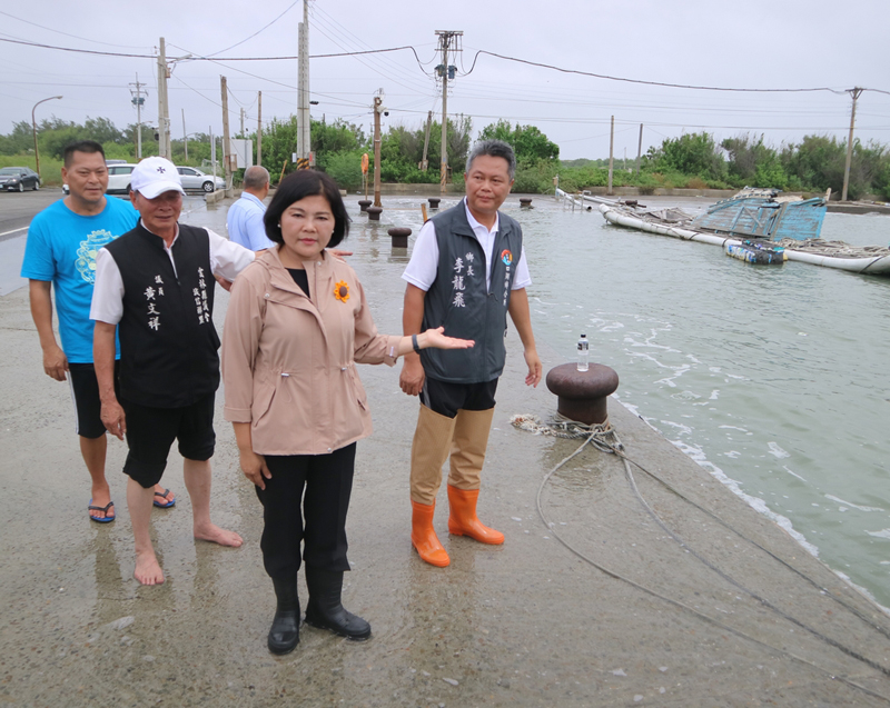 【記者雷琇雯雲林報導】受到天文大潮及卡努颱風西南氣流的雙重影響,雲林縣口湖鄉箔子寮漁港近日發生嚴重的溢堤,海水倒灌造成碼頭道路積淹水及鄰近養殖魚塭受波及,縣長張麗善率縣府團隊並會同縣議員黃文祥、蘇國瓏、蕭慧敏、口湖鄉長李龍飛、鄉代會主席王溪邊等勘災,並聽取漁民全面加高堤防及漁港外移的意見。