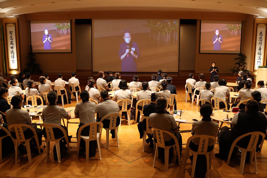 學員於新店靜思堂大愛廳靜候,準備與 上人進行溫馨座談。全臺業務負責人報告各區溫馨故事。長照推展中心副召集人 莊淑婷副院長表示:慈濟2018年12月正式成立長照推展中心,感恩四大志業的全力配合與社區的師兄、師姊做後盾,共同促進長者的健康照護。