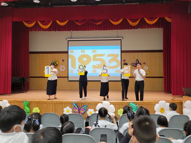 小學部的孩子年紀小,為了更有效的學習,特別以「善逸上學去」反霸凌、反毒小短劇,吸引學生們的注意,藉由新生「善逸」到校所受到胖虎及阿福同學的欺負,甚至誤食毒品的過程,提醒孩子除了要彼此友愛,不可霸凌同學,當遇到被欺負時,可以告知學務處及輔導室師長外,也可以寫信給「小熊」(信箱),校外亦可撥打教育部「1953」反霸凌專線,最後也提醒孩子要注意「糖衣陷阱」,新興毒品包裝成各式各樣的糖果,一不注意就會誤食,所以要「拒絕毒害才能前途無礙」。