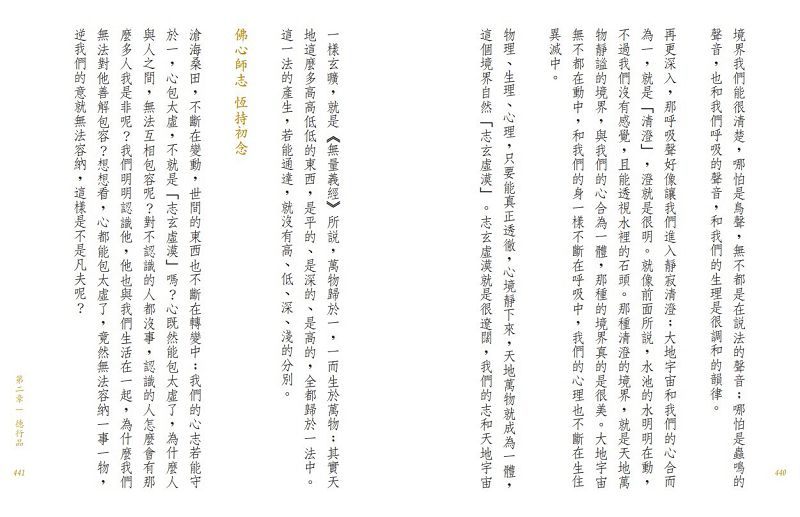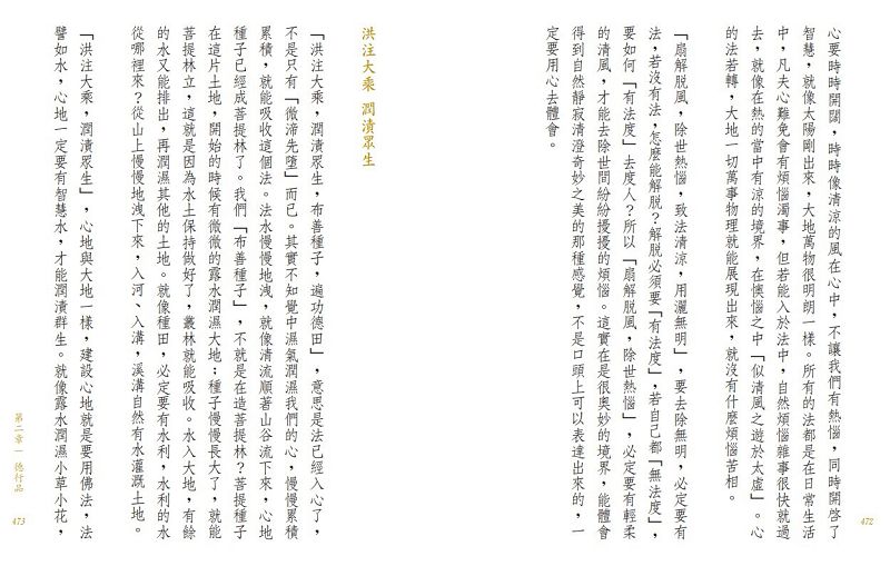 「〈說法品〉的真空妙有,要好好地去研究。宇宙之間都在說法,我們所能看到的都是假相,凡事都是因緣會合。一花、一草、一木,不斷在新陳代謝。因緣離開了,就什麼都不會產生;因與緣會合,天下萬物就有了。」