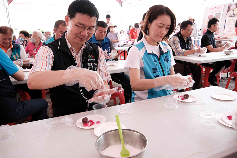圖說2:客委會主委江俊龍與立法委員江啟臣夫人劉姿伶及現場貴賓體驗鎌村里在地特產玫瑰冰心月餅。(記者彭勝郎攝)