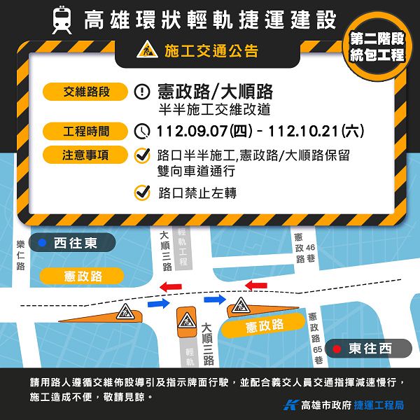 【記者陳志昌高雄報導】配合「高雄環狀輕軌捷運建設(第二階段)統包工程」施工,憲政/大順路口規劃兩階段交通維持半半施工,第一階段北側交維施工於112年9月6日完成,自112年9月7日上午9時起至112年10月21日計45天,進行第二階段南側交通維持改道作業,市府捷運局表示,本次交維設施範圍為憲政路/大順路交叉路口,請駕駛人行經施工路段時務必依循交維佈設導引及指示牌面行駛。