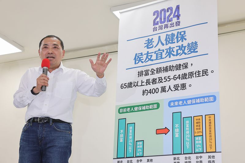 侯友宜表示,未來他擔任總統,65歲以上民眾以及55歲以上原住民,可享有排富全額補助健保,排富以綜所稅課稅20%稅率為標準,預計約有400萬名長輩可享健保免費的優惠,經費預估160億元。