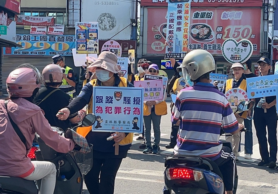宣導隊伍向民眾發放警示燈、銀髮族反光拍拍圈等宣導品,提醒民眾「喝酒不開車、開車不喝酒、酒後代駕、安全回家」、「行經路口請遵守交通號誌並走行人穿越道」、「綠燈秒數足夠才可安全通過」、「穿越路口左右察看並注意轉彎車」、「駕駛車輛行經路口時,應暫停禮讓行人」、「騎乘機車、腳踏車均應依規定戴安全帽」、「闖紅燈生命亮紅燈」、「夜間請著亮色衣,安全看的見」、「方向燈全程打、安全左右轉」等交通安全主題。