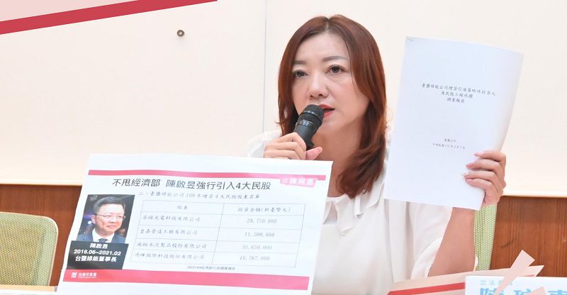 陳琬惠揭露,陳啟昱在2021年離職後,吳容輝接任台鹽綠能董事長至今年1月底;令人震驚的是,吳容輝竟然任用同樣與英系關係密切、曾為力暘能源EPC下包商的吳博鑫擔任總經理;吳博鑫還任用英系大將陳文宏的哥哥陳文龍擔任特助,由其主導台鹽綠能的會議,吳容輝、王美花都應說清楚,把國家推動綠能的公司交給民進黨派系旗下的人操控,到底是什麼用人標準?,顯然綠營權貴已然肆無忌憚地將手伸入國家推動綠能的公司中。