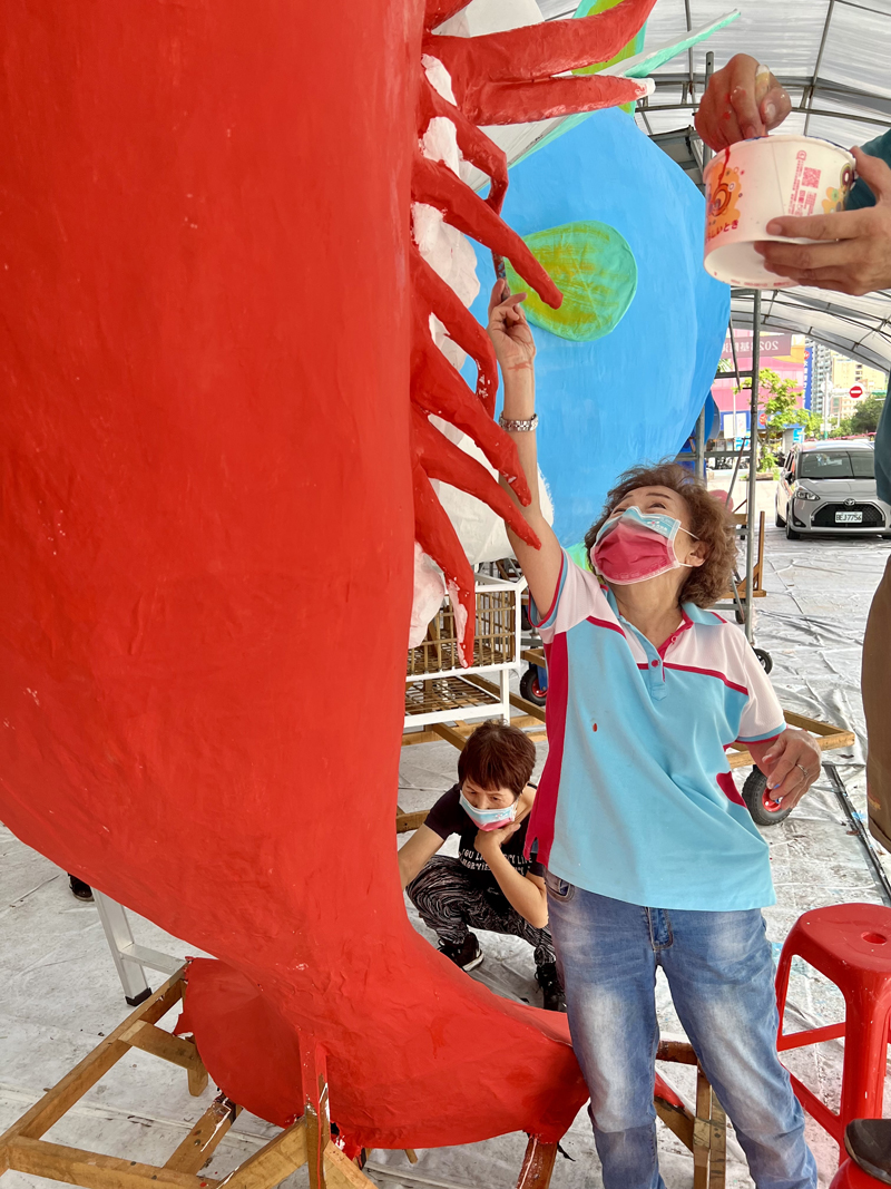 蔡秋霖表示,每年的嘉年華遊行,都推陳出新,有不同的海洋生物等造型上街頭,所以每年都要重新設計製作。赫然發現正在為懷卵的大紅海蝦,用紅筆為巨蝦蝦足上色的志工,竟然是曾連任8屆市議員,人稱「媽祖婆的鄭林清良,她說擔任五福社區的成員,因此參上一腳,參加大紅蝦的製作,非常有成就感。