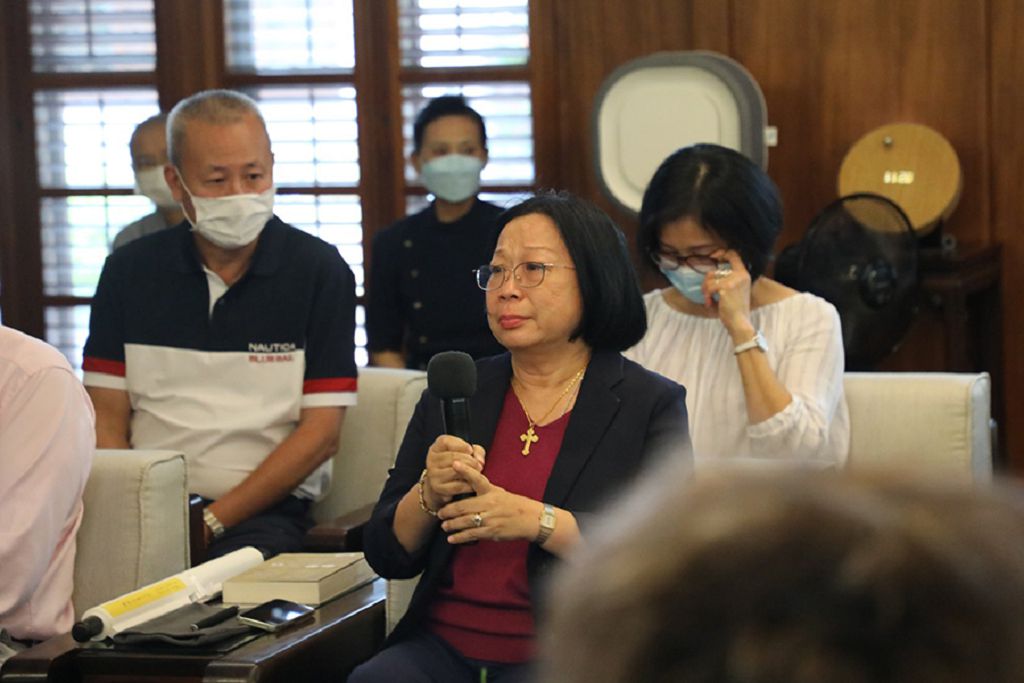 前新加坡外長楊榮文之妻梁利平,見到證嚴法師,想起當時為救小兒子奔走半個地球只為找尋一線生機的過程,忍不住激動落淚說感恩。