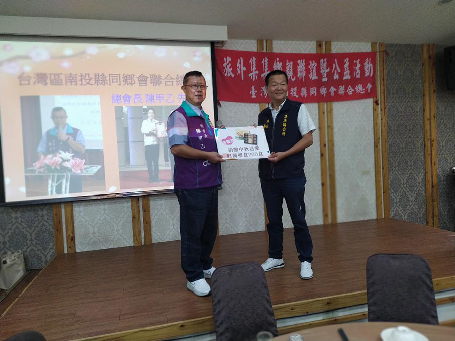 4.聯合總會長陳甲乙致贈中秋禮品由集集鎮長吳大村接受。〔記者陳良安攝〕