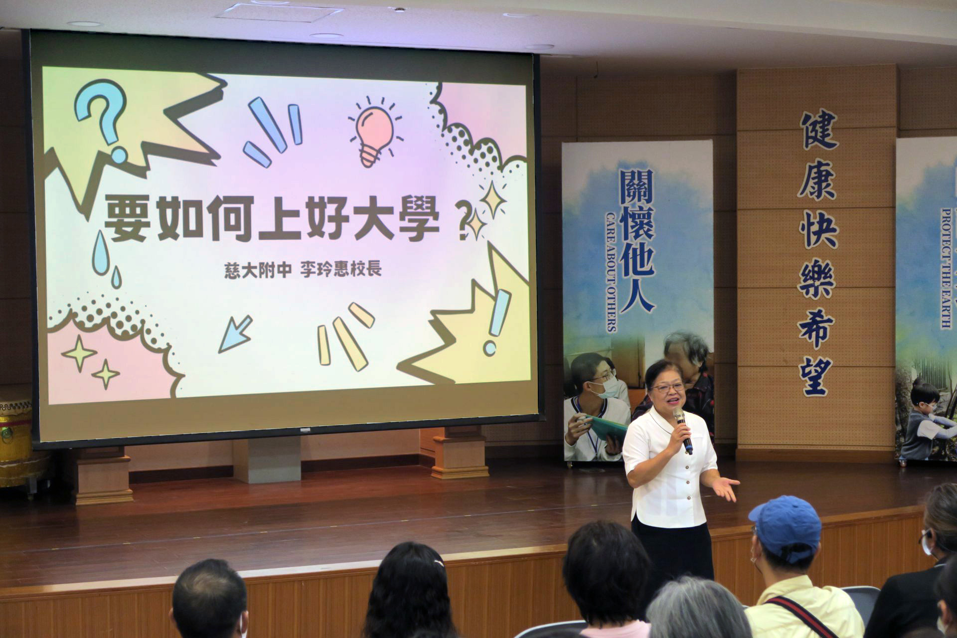 放眼國際,慈大附中致力培養世界級的人才,特別規劃了十條國際路線,並擁有30多所姊妹校,高中部同學面臨升學階段,李玲惠校長以「如何上好大學」為題,開啟家長對於就讀慈中三年後的想像,強調好環境、好朋友、好資源的重要性。各處室則接續此概念,以「全球公民·世界人才」為題,分享慈中如何為孩子儲備成為世界級人才的能量,並邀請畢業校友謝秉鈞分享自身的學習經驗。