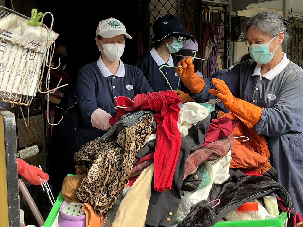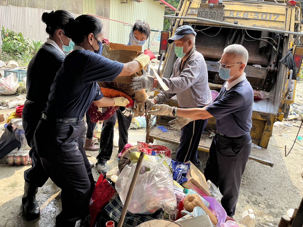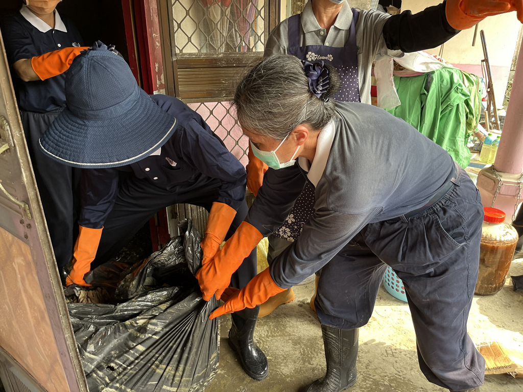 志工除立即著手將一件件將被泥土水浸入的家當、箱子、衣物、接力式的一件件全搬出來戶外空地外,也分組馬上在外面空地做出分類,清洗,將屋主告知不要的回收資源送上環保車,經屋主確認為已無法使用的家當,則一一投入垃圾車。