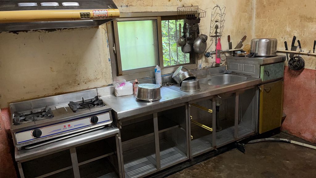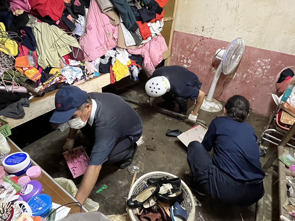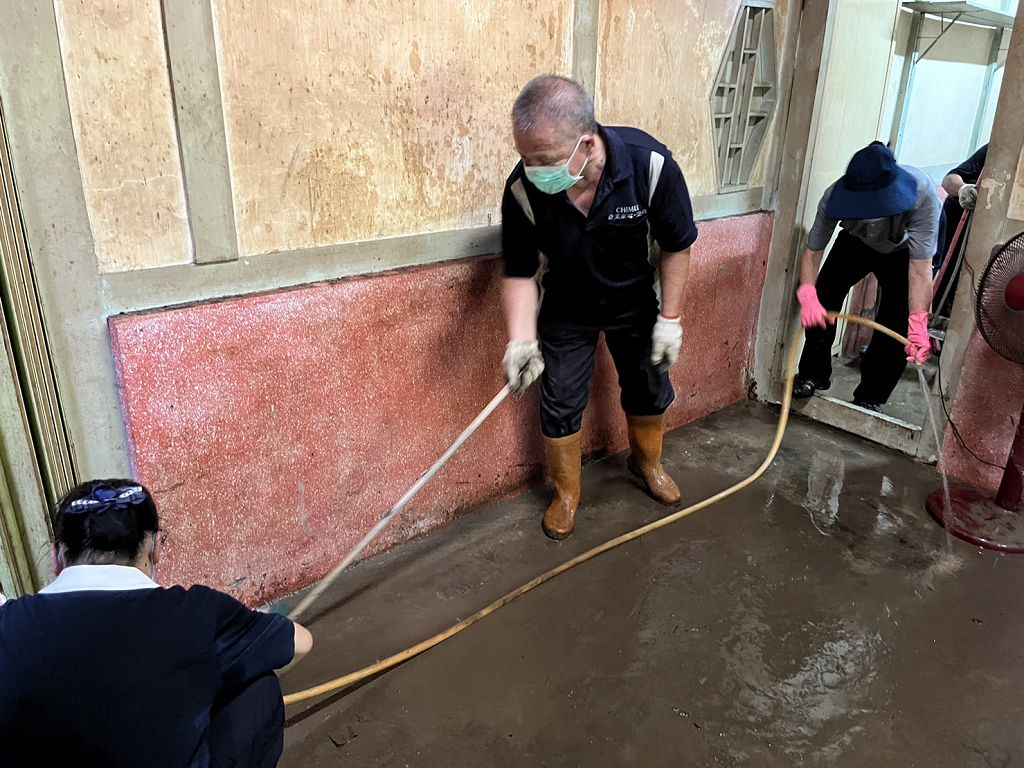 屋內也提著一桶一桶的水清掃出泥巴水,從地面、牆壁、到天花板所有汙泥,髒亂都逐一掃除乾淨。每個房間常年囤積累積的塵土在這次的汙泥滲入混攪一團,志工一把手、接一把手持續雙手動不停的一直清理,志工的衣褲都已汗水浸溼了,仍不停的清理著。