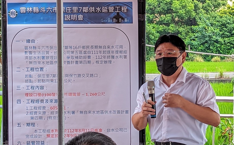 劉建國進一步指出,自來水公司經過多次規劃與設計,完成了總長1.26公里的管線設計圖。水利署也在今年8月核定了「雲林縣斗六市保庄里7鄰供水延管工程」,總經費約為600萬元,預計於9月25日展開施工,當地居民終於迎來可使用的自來水。