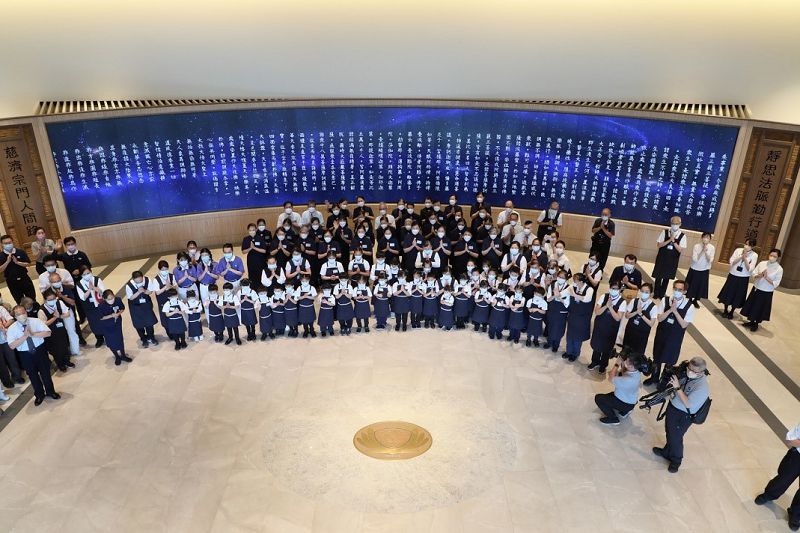 8月19日是「靜思小志工暑期人文營」活動第三天,一百多位小志工正在三樓講經堂彩排練習音樂手語。當天適逢上人行腳至關渡靜思堂,於是安排了年紀最小,還在讀幼兒園的小小志工前往一樓,和師姑、師伯們列隊在無量義堂,等候恭迎上人。