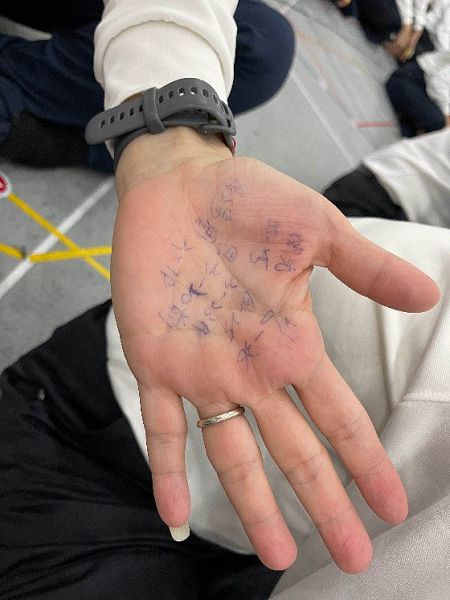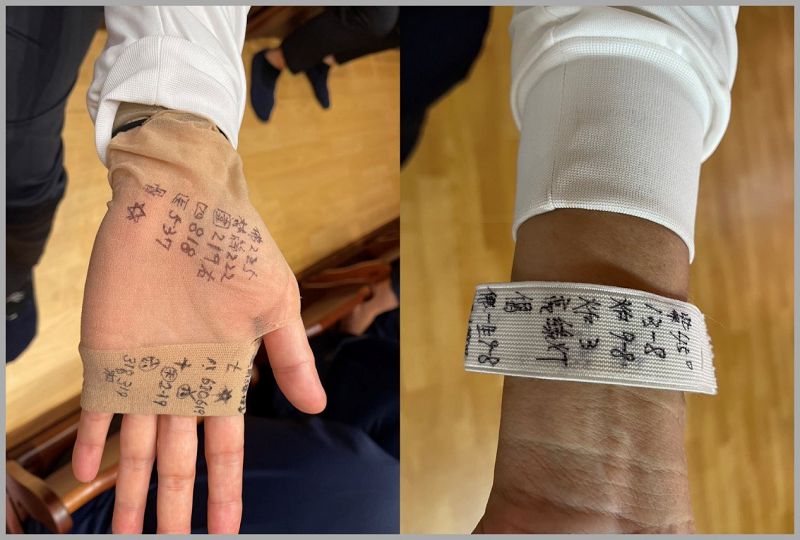 有法親未及參加第一次走位練習,第二次練習時,發現她手掌上寫了許多只有她自己看得懂的數字,當天她靠著手上的密碼,以及身邊法親的「帶路」,安然度過。