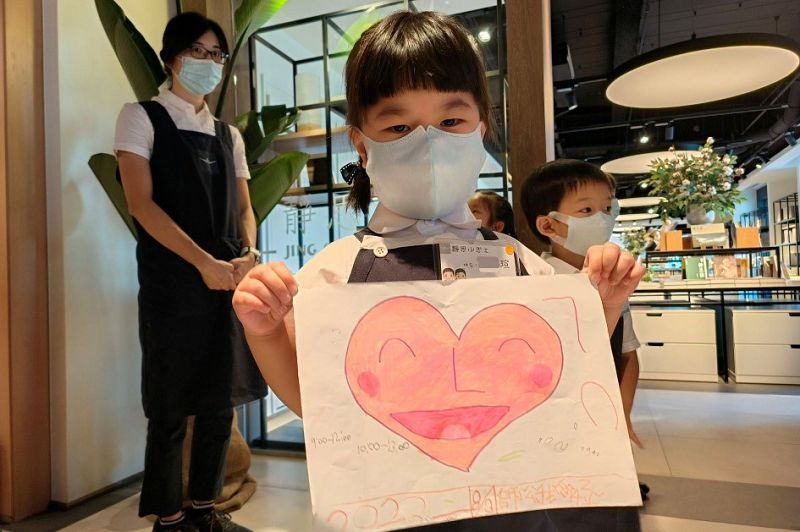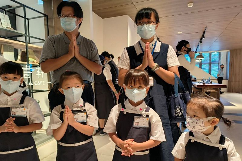 其中,有幾位小小志工列隊在靜思書軒門口,等待恭迎上人進入書軒。在等待期間,突然傳來稚嫩的聲音說:「師公上人年紀很大了,不要催他,讓他慢慢走。」這句貼心的話語,是來自誠品信義店,年僅四歲的小志工洪巧桐。