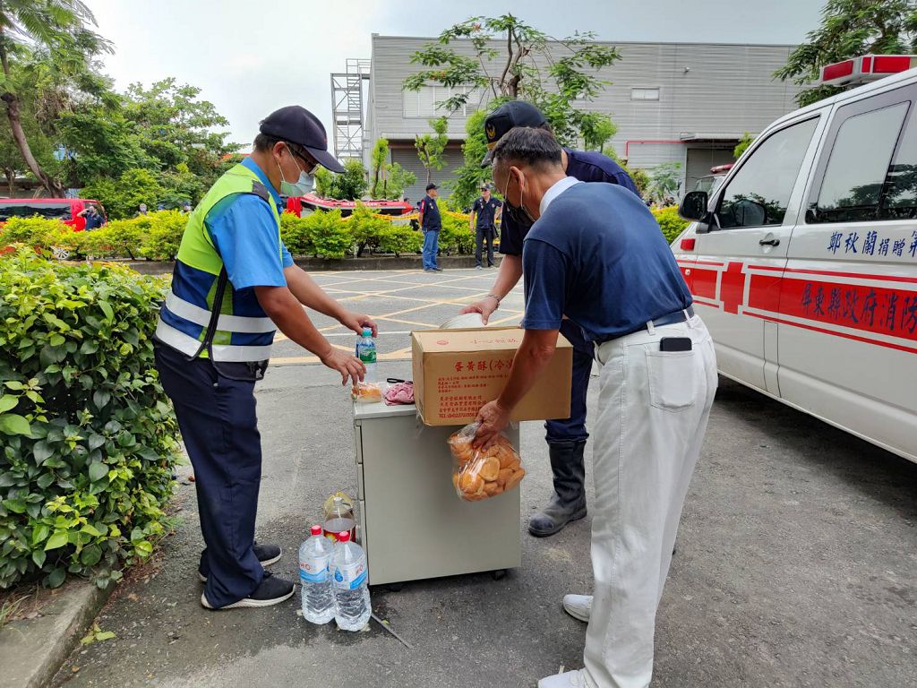 9月23日早上10點,慈濟志工即前往家樂福採購10箱礦泉水、100份麵包前往災害現場送給警消。同一時間,慈濟志工與社工與屏東縣衛生局、社會處取得對接,並成立服務站。