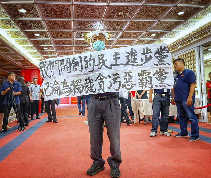 【記者陳昱憲綜合報導】民進黨主席賴清德27日中午前往創黨地圓山大飯店,參加創黨先進聯誼餐會卻碰上尷尬一面。創黨元老、前立委魏耀乾在場外舉牌怒斥「我們開創的民主進步黨,已淪為獨裁貪污惡霸黨」,點名派系新潮流盤據政府各部門,把持銀行、國企、掏空國庫、朋比分贓,是台灣島上的哥吉拉。