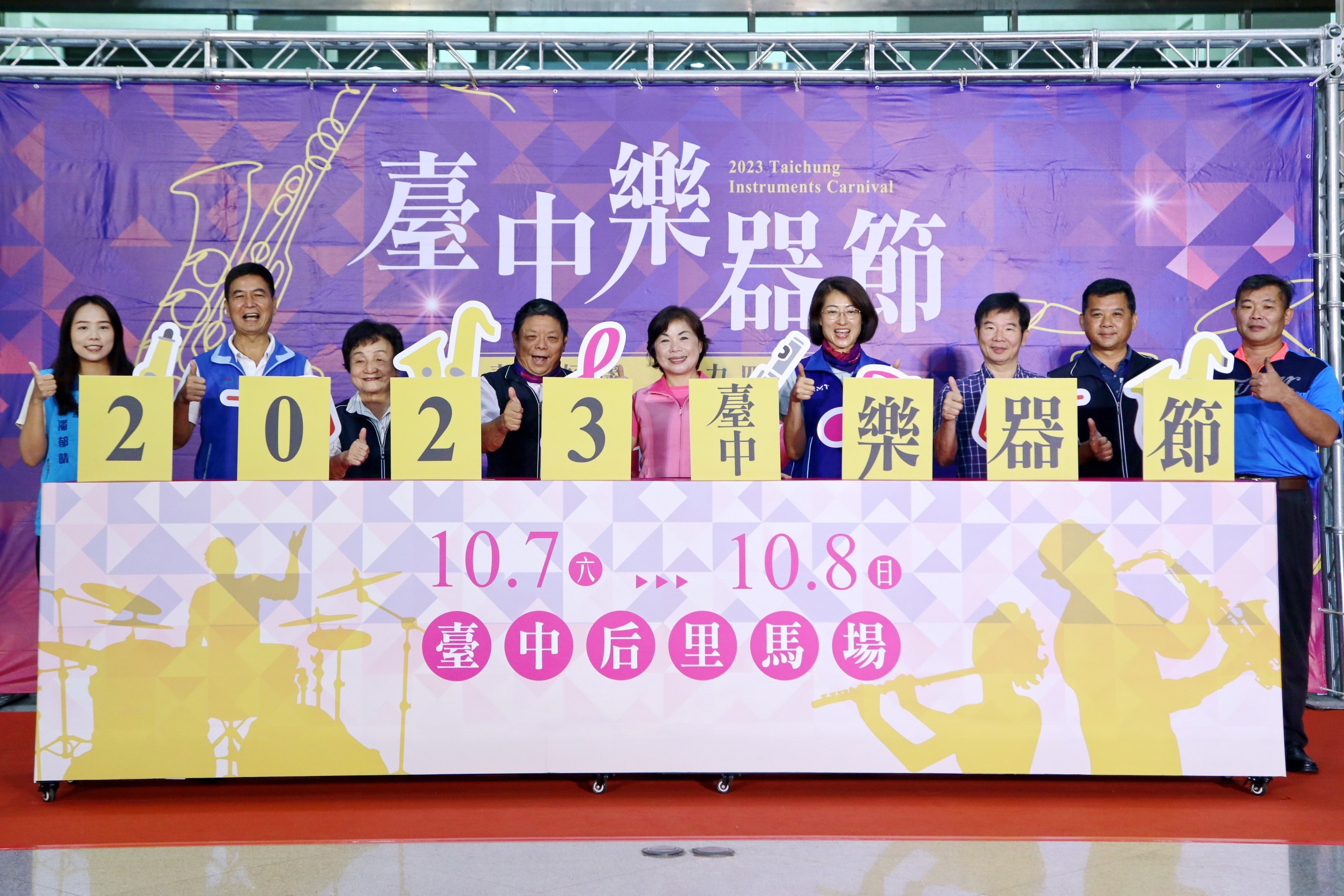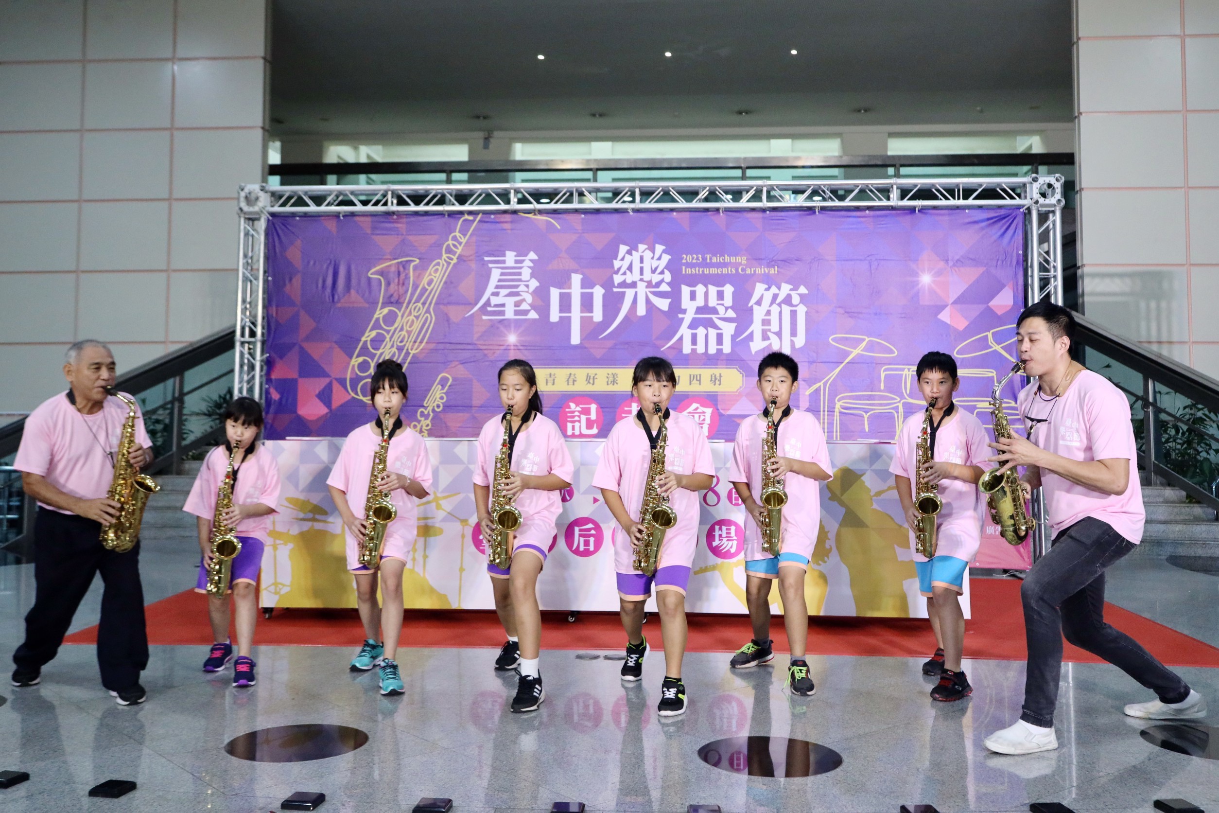 「2023台中樂器節」記者會26日於市府陽明大樓舉行,邀請校長黃財源及吳文欽老師,帶領來自后里七星、泰安、育英國小的學生,共同合奏「台中,我愛上了」樂曲,宣告2023台中樂器節將於10月7、8日在后里馬場盛大登場。