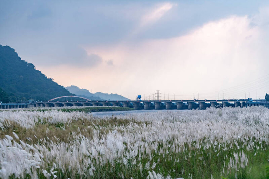 民眾說,這兩天前往集集攔河堰一帶散步,看見大量的官芒草開花相當美麗,花況比上週更好,從攔河堰附近往上、下游望去,雪白花穗在天空與攔河堰壩體襯托下,展現有別於溪床上的景致,預計攔河堰的官芒草最佳花況,可再維持1週至10天。
