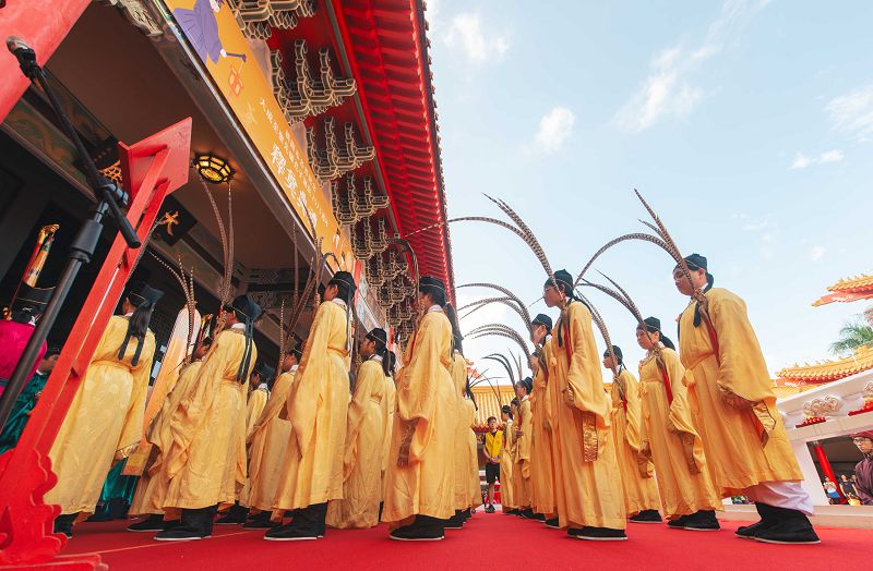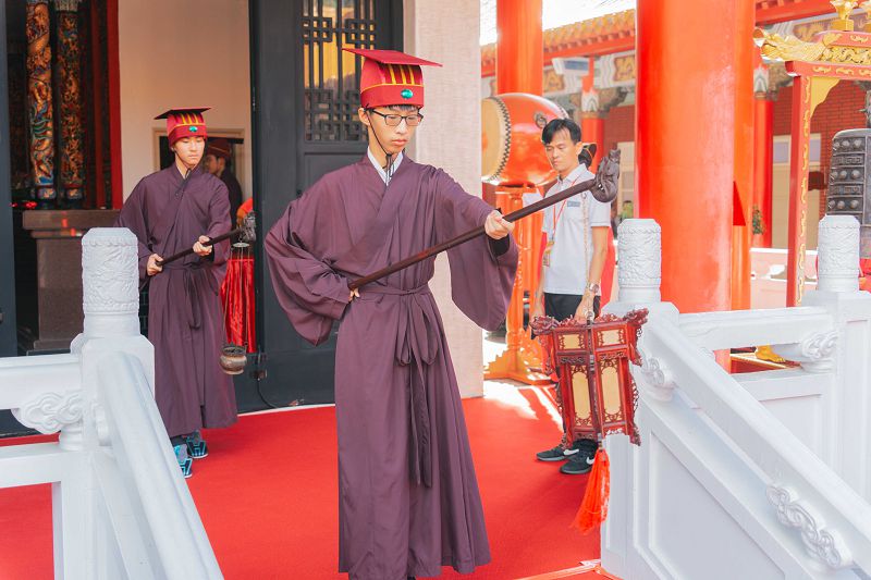 祭孔大典在宮庭雅樂中展開,釋奠典禮依循三獻古禮32道儀程,由市長張善政擔任正獻官,帶領市議員林政賢、陳美梅、黃婉如及中華孔子後裔儒學促進會等人擔任分獻官,民政局長劉思遠擔任糾儀官,陪祭官則由本市教育局、文化局等各界代表擔任,向至聖先師及老師們致上崇高敬意。