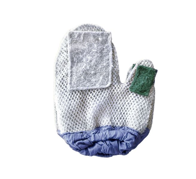 「好特殊」,特殊在哪裡?它的形狀像手套,整個是透水的洞洞布材質,避免雙手浸泡在清潔劑中太久,而手掌、拇指處車上菜瓜布,好刷洗又兼顧效率。