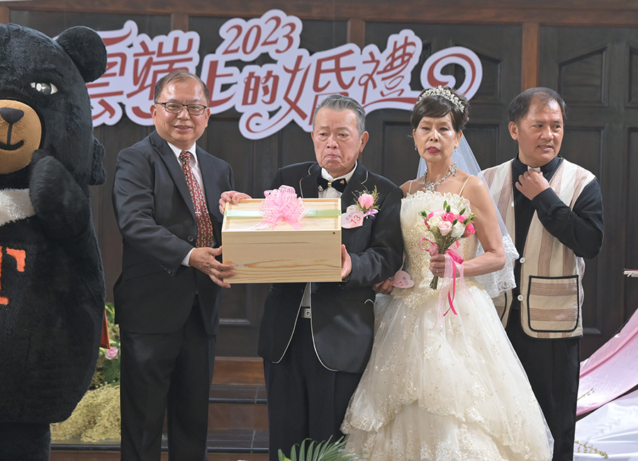 在近百名家屬親友的觀禮下,教堂敲響幸福鐘聲,祝福新人們終身幸福,婚禮由參山處長曹忠猷主持,並邀請到財團法人台灣基督長老教會泰雅爾中會徐正義牧師為新人們勉勵祝禱,現場還邀請到台灣觀光大使喔熊組長擔任花童引領新人進場,熱鬧非凡。