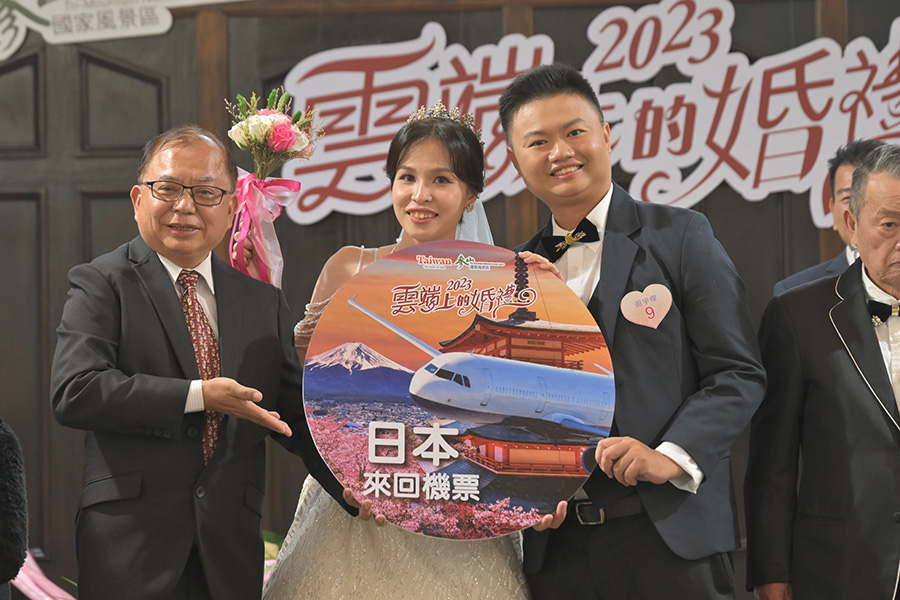 圖說3:參山處長曹忠猷頒贈成家禮金,以及抽出1對日本來回機票,由周宇傑及劉家妤新人幸運獲得。(參山處提供)