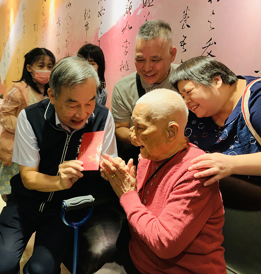 圖說2:副市長黃國榮送紅包祝福百歲的黃彭人份阿嬤子孫滿堂。(記者彭勝郎攝)