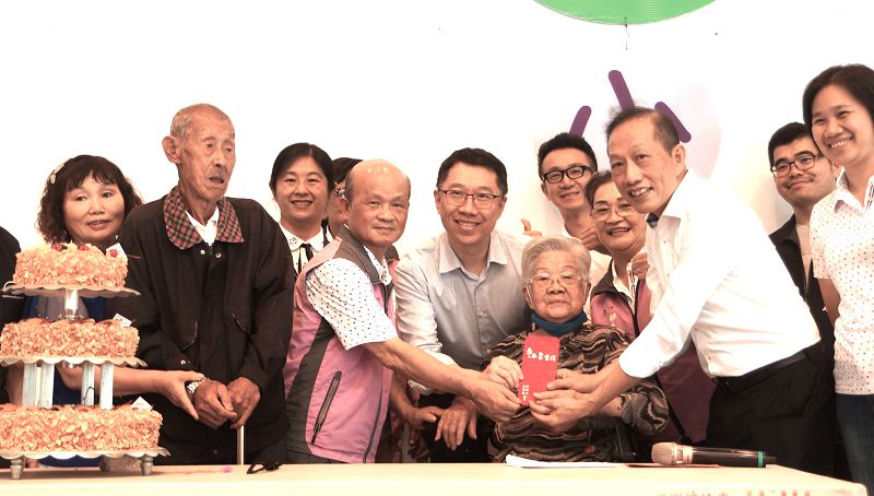 最後在眾人高喊「從頭切到尾,順風又順水,從左切到右,健康又長壽」聲中,切蛋糕並致贈2位百歲人瑞紅包,共同歡度重陽節。(圖:記者徐玉英攝)