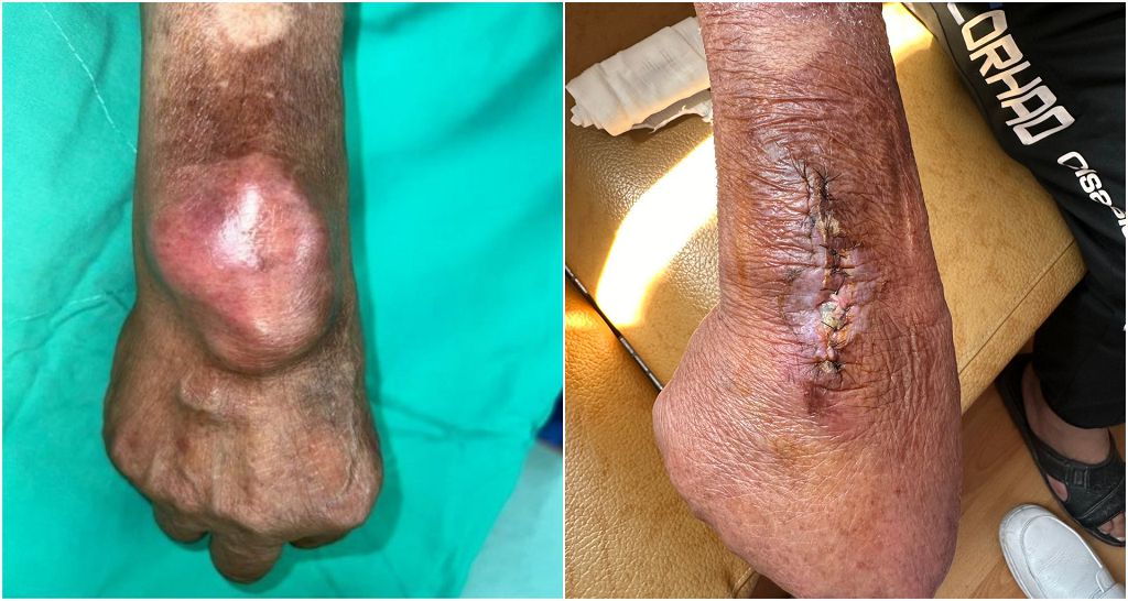 張凱閎醫師指出,病人到院時提到他在8個月前工作時有異物刺入,但沒有特別注意,化膿後先手擠出膿液,沒想到傷口癒合後卻持續腫大,先到診所看診沒改善,才轉往花蓮慈院求診,當時研判是黴菌感染過久擴大,切除發炎、感染組織後,先進行傷口照護,之後再縫合傷口重建。