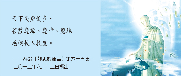 現在氣候變遷,地、水、火、風四大不調導致災難之大不可抗拒。這是眾生共業,格外需要我們時時刻刻培養善念,把握機會關懷苦難,多多造福行善。