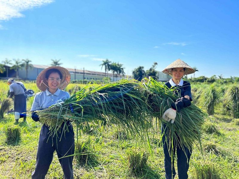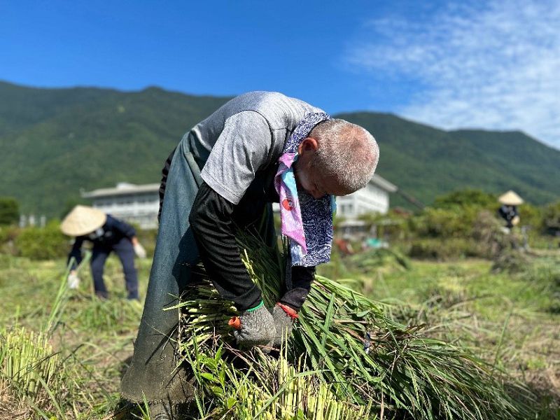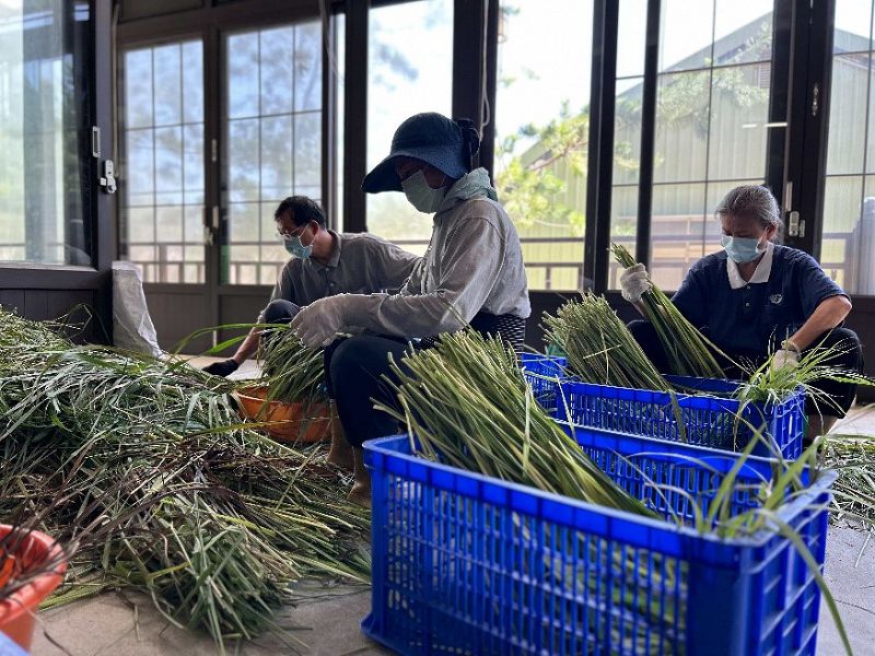 檸檬香茅因葉片細長,採收時會有葉片四散各處的可能,因此增添採收的困擾;為此,每回採收都會先進行綁香茅,讓植株收攝一處,方便採收。感恩八月二十五日「慈大附中合心共識營」的好因緣,有二百二十位的師生及慈誠懿德菩薩們,趕在開學前,一起下田協助綁香茅。
