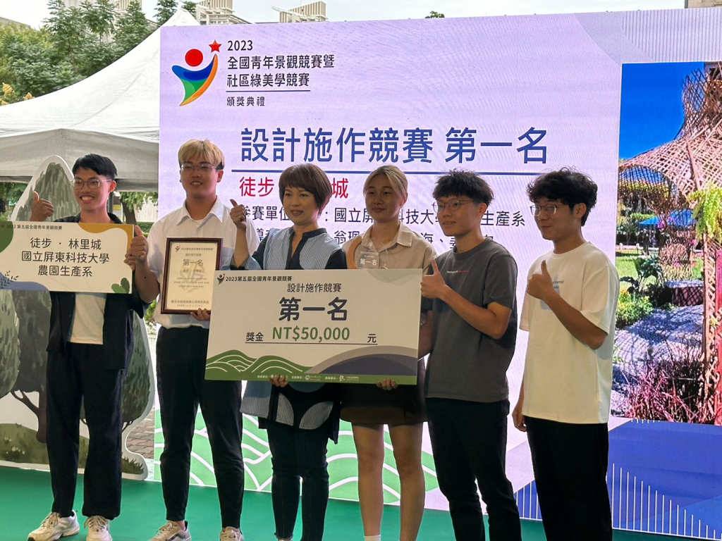 【記者高金次新北報導】2023第5屆全國青年景觀競賽首獎揭曉啦!!設計施作組由國立屏東科技大學農園生產系團隊的〈徒步•林里城〉奪冠,競圖組則由台大園藝畢業生鄭萱、卓仁豊的〈柳堤泛月-低碳永續實驗場〉拿下第一名。新北市推動農業健康式,由全國青年景觀競賽甄選出10組優秀青年景觀團隊實作改造柳堤公園景觀,自即日起展覽至11月30日止,歡迎大家蒞臨觀賞。