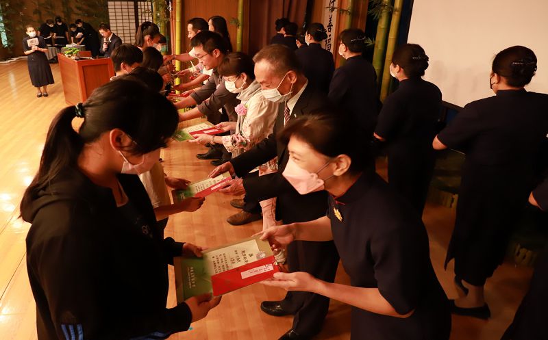 〈祈禱〉聲中,志工文素珍勉勵學子們:「在這裡可以感受到溫暖,滿滿的愛,慈濟五十八年來為臺灣社會、為世界,做了許許多多的慈善教育工作,只要遇到災難,藍天白雲就出現了,許多志工就會在災民身旁,當救災告一段落,物資有了,最後最重要就是要教育,慈濟非常重視這一塊。」