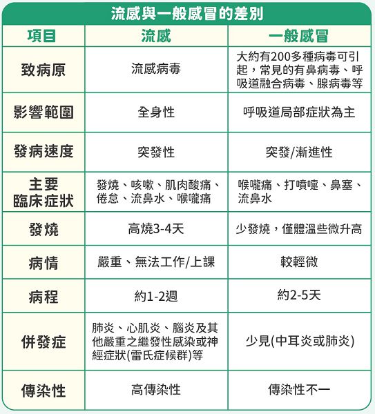 臺北榮民總醫院桃園分院感染管制室護理師張倢語表示,流感與一般感冒病原不同,一般感冒主要是由鼻病毒、冠狀病毒、腺病毒等引起;流感則是「流感病毒」所引起,嚴重會致命。臨床常碰到患者以為是一般感冒,且一開始症狀輕微,結果沒幾天、就開始全身肌肉痠痛。然而,高風險族群感染流感病毒後可能引起肺炎、腦炎、心肌炎及其他嚴重之繼發性感染或神經系統疾病等嚴重併發症,需住院治療,甚至可能導致死亡。流感主要傳染途徑是經由咳嗽或打噴嚏產生的飛沫傳染,而且流感病毒可短暫存活於物體表面,所以也有可能經由接觸傳染。