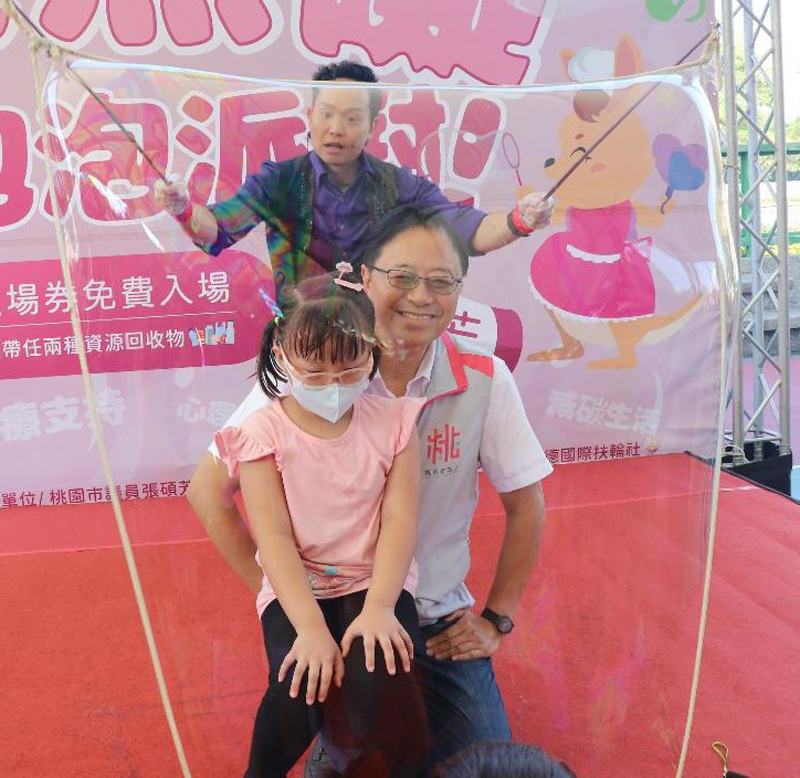 【記者鍾陽正桃園報導】桃園市為愛勇敢文教協會在世界早產兒日前夕,日前在桃園區三民運動公園舉辦「SDGS有愛無礙親子泡泡派對」,由理事長張碩芳市議員主持,吸引千餘位民眾及小朋友參與,市長張善政、教育局長劉仲成、市議員牛煦庭、陳美梅、陳韋曄、梁為超、簡志偉、錢龍、桃園區長許敏松、立委候選人邱若華、耀登科技董事長張玉斌、八德耀德社社長Emily等人均踴躍出席活動與民眾互動,展現對早產兒及特殊兒的關懷。