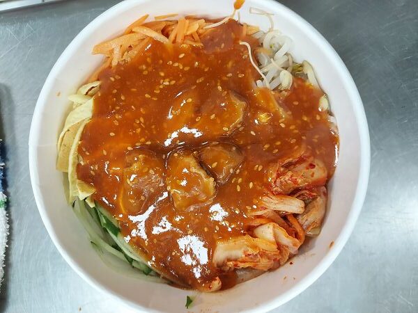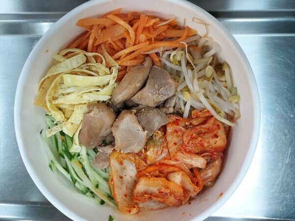 二、拌飯製作,材料:雞胸肉、韓式泡菜、雞蛋、豆芽、小黃瓜、紅蘿蔔、太白粉、白飯。調味料:醬油、糖、白胡椒粉、鹽、油。製作方法:1.小黃瓜、紅蘿蔔刨絲,韓式泡菜切絲。2.紅蘿蔔絲以少許油、鹽巴炒軟後備用。3.豆芽入滾水(加少許鹽巴),燙軟後撈出泡冷水,冷卻後撈出瀝水備用。4.雞蛋打勻,加入太白粉水攪拌均勻,起油鍋以文火煎蛋皮,放涼後切絲備用。5.雞肉以醬油、糖、白胡椒粉及太白粉醃製,以滾水下鍋,蓋上鍋蓋煮開後關火燜30分鐘,撈出剝成絲或個人喜愛之尺寸大小備用。6.將白飯盛於容器內,依序放入食材,最後再淋上醬汁即可食用。