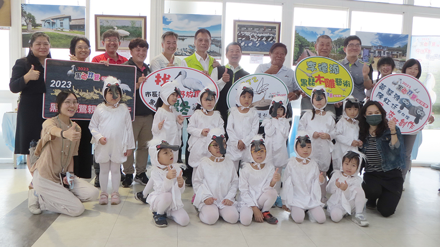 台南市立學甲幼兒園園長顏春枝率領小小黑琵愛跳舞,美麗的表演為黑琵木雕、鐵絲造型、黑琵皮革文創作品展前記者會揭開序幕,包括交通部觀光署雲嘉南濱海國家風景區管理處副處長洪肇昌、七股區長李佳隆、七股遊客中心技正王美欣、台鹽公司七股鹽場場長李俊宏、市府農業局保育科長朱健明、立委郭國文執行長黃熙順、市議員蔡蘇秋金助理蔡寶財、市議員陳昆和秘書陳永棧等貴賓都出席。