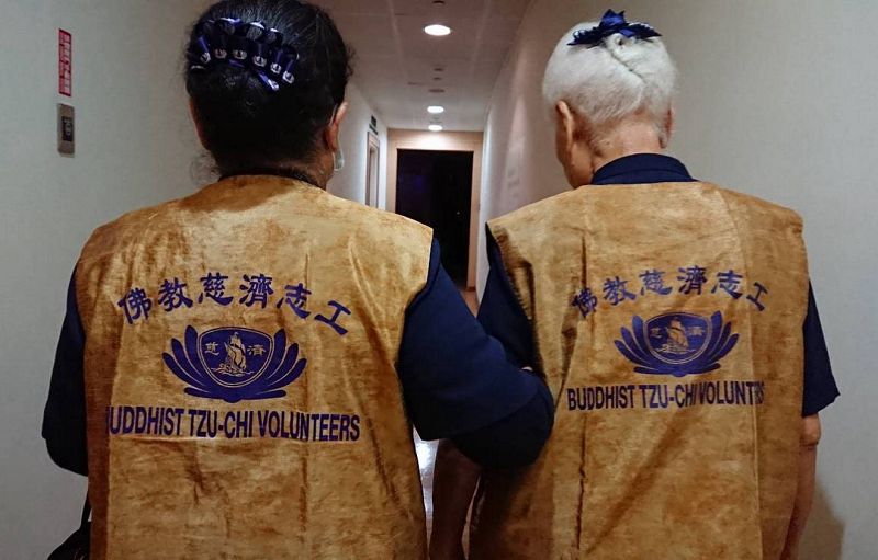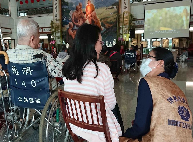 在為公公辦理出院的一個多小時等候時間裡,我觀察著人們的表情、動作與言語;因為久候,不少人頗不耐煩。同時也有一群穿著慈濟制服,罩上暗褐色背心的醫療志工在現場陪伴與協助。