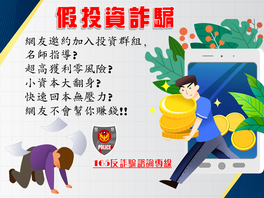 請勿輕信來源不明投資管道或網路連結、臉書名人廣告,如遇到加「LINE」進行投資必為詐騙。「165防騙宣導」LINE官方帳號及165全民防騙網可查詢詐騙LINE ID、假投資(博弈)網站及詐騙電話。「165全民防騙」臉書粉絲專頁每週公佈投資詐騙網站,提供民眾即時掌握最新詐騙訊息;或投資前可至投信投顧公會網站(www.sitca.org.tw)查詢合法投信(顧)公司,保障個人財產安全第一步。(臺中市政府警察局廣告)