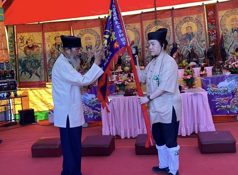 【記者林獻元台中報導】中國武當道教太玄法師協會日前舉辦第25屆「啟建癸卯科祈安衛道揚玄上登108層刀梯武考戒品及文奏授籙醮會」,吸引10餘人報考。51歲蕭晏渝由創會會長蕭道賢授旗,正式承接衣缽,主持今年武考道務。畢業於逢甲大學會計系的蕭晏渝,三度攀登刀梯通過法師武考,接棒成為女道長,將力推道學研習,培植更多道教法師人才,為善信服務。