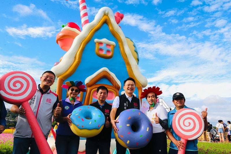 農業局表示,今年邁入第9年的「2023桃園花彩節」,從11月11日至11月19日,在桃園市大溪區月眉休閒農業區舉辦。桃園花彩節已經成為一個品牌活動,也是桃園最多人造訪的戶外大型活動之一,今年活動主題為「花舞童話」,農民以童話故事為發想,讓波斯菊、百日草是顏料,農地為畫布,鋤頭當畫筆,創作出一幅幅廣袤的田園畫作。在歷屆花彩節中,今年的花田圖騰面積最大、圖案最多,此次花田圖騰面積高達8公頃,圖樣有膾炙人口的白雪公主、三隻小豬、小美人魚、小紅帽與大野狼等,超過20款獨家打造的圖騰樣式。花田間也有擺放吸睛的裝置藝術,其中最為亮眼的是一座5公尺高的夢幻糖果屋,周圍擺放的糖果餅干還可拿起來拍照。
