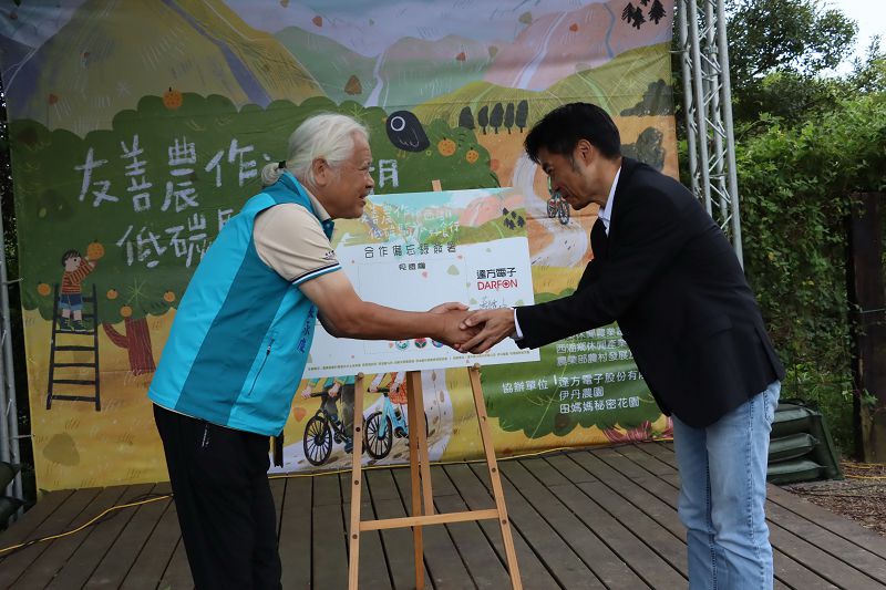 西湖鄉休閒產業發展協會理事長張永慶、達方電子總經理蔡耀坤,雙方簽署MOU合作備忘錄。