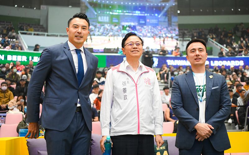【記者吳惠民桃園報導】桃園市長張善政13日晚間在市府顧問陳信守、體育局長許彥輝、觀旅局副局長施照輝、桃園市體育總會理事長葉俊毅、桃園璞園領航猿籃球隊總經理陳信安、台啤永豐雲豹籃球隊執行長張建偉等人陪同下,前往桃園市立綜合體育館,出席「2023-24年職業籃球賽季-桃園城市籃球隊共用主場交流賽」。
