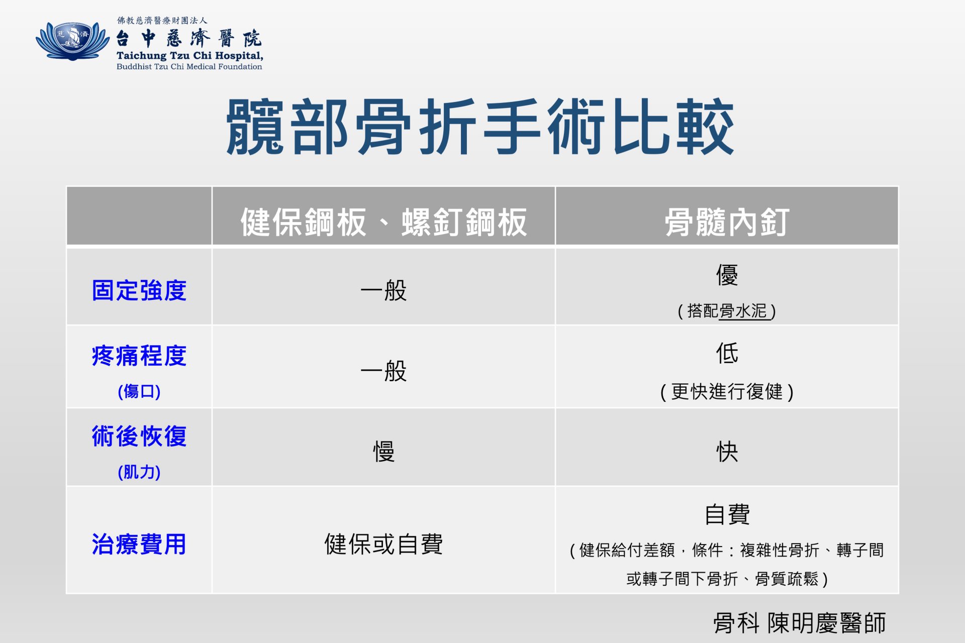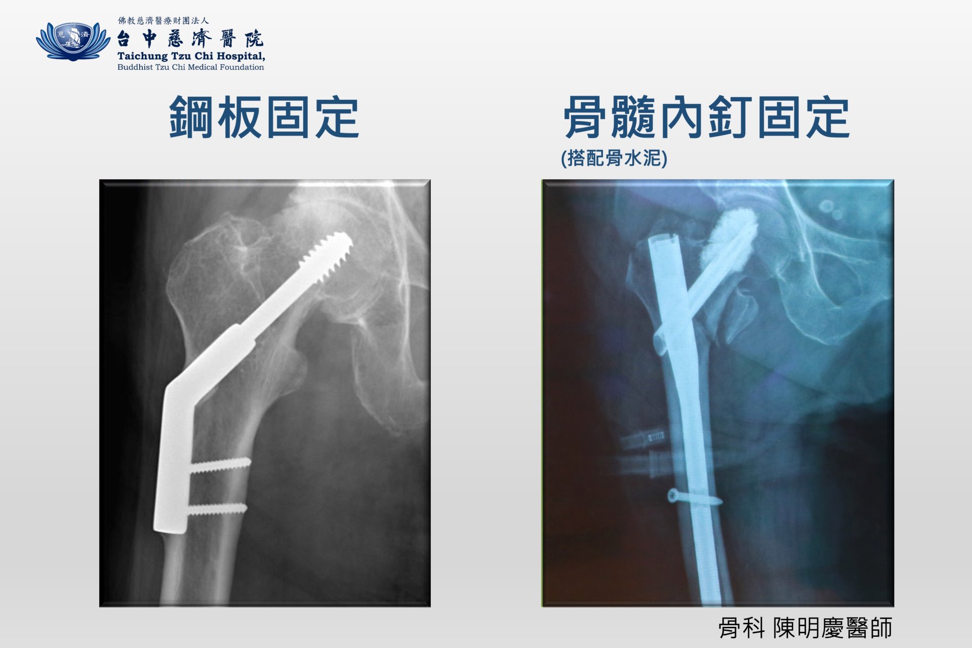高齡八十七歲婦女在家跌倒,造成右邊臀部疼痛而無法走路。台中慈濟醫院骨科醫師陳明慶檢查為髖部「近端股骨骨折」,考量年齡因素,與病人家屬討論後,實施「微創骨髓內釘固定復位」手術,術後第二天病人就可以下床站立。陳明慶說,骨髓內釘搭配骨水泥固定優於傳統鋼板,只要條件符合,健保有差額給付。