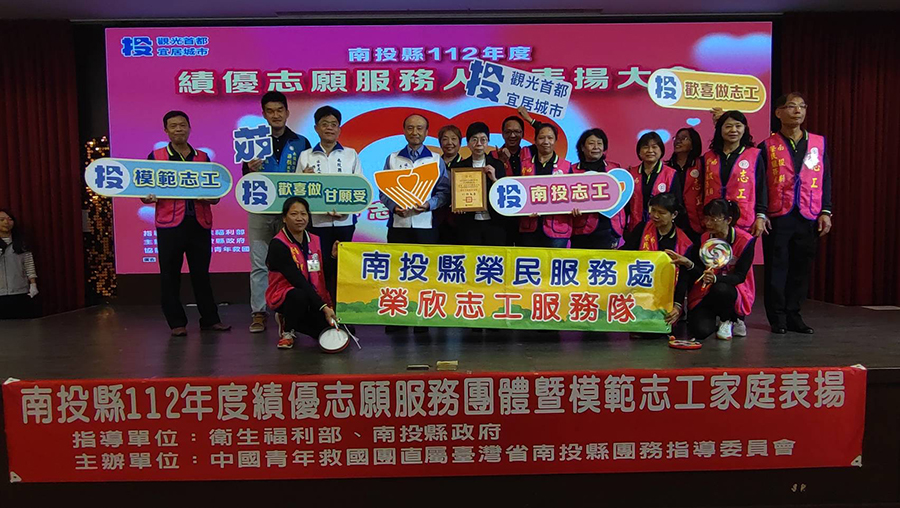 王處長感謝榮欣志工團隊長期不辭辛勞、無私無悔地用心關懷服務轄區榮民眷長輩,也就是因為秉持這種出於真心、不求回報的真情付出、默默耕耘,才能獲得南投縣政府對我們榮欣志工團隊的肯定,除了祝賀志工同仁獲獎殊榮外,更期許團隊在既有優良的基礎上,持續做好各項服務照顧工作。” />南投縣榮民服務處榮欣志工隊今(112)年表現十分亮眼,除榮欣志工團隊榮膺縣政府「績優志願服務團體」佳績外;另有包括羅木山及黃秀惠夫妻檔當選模範志工家庭、榮獲南投縣志願服務銀質徽章的黃春蘭志工,獲頒銅質徽章的林益聖志工等多位志工伙伴受獎,全體南投縣榮民服務處同仁均深感與有榮焉。