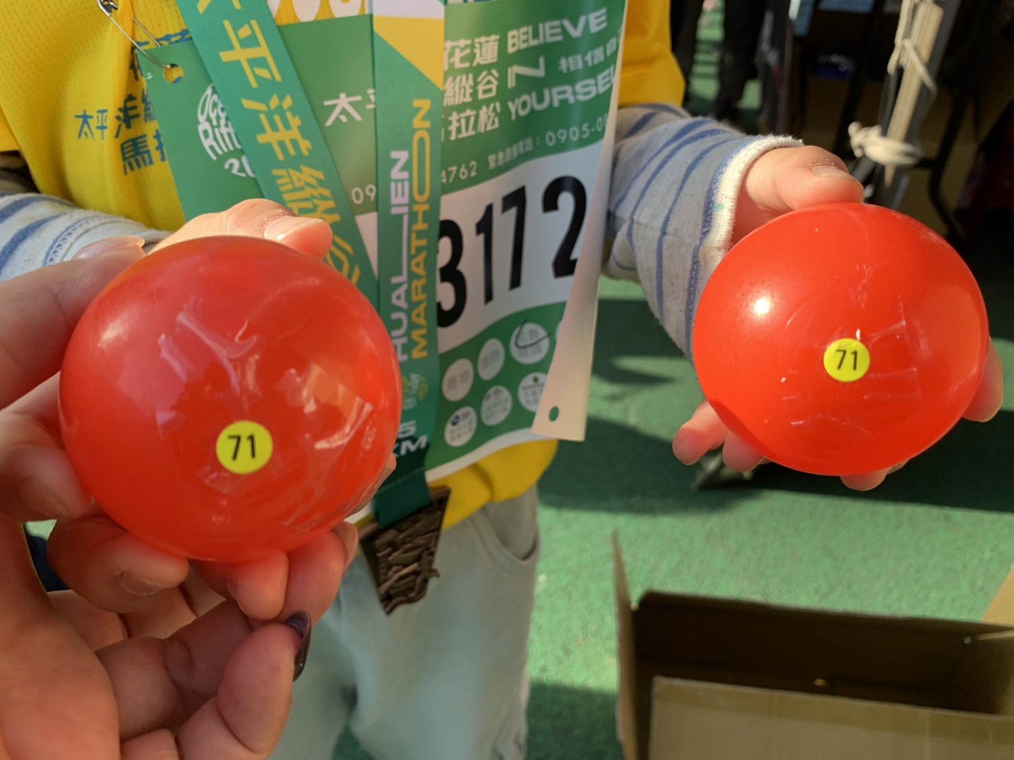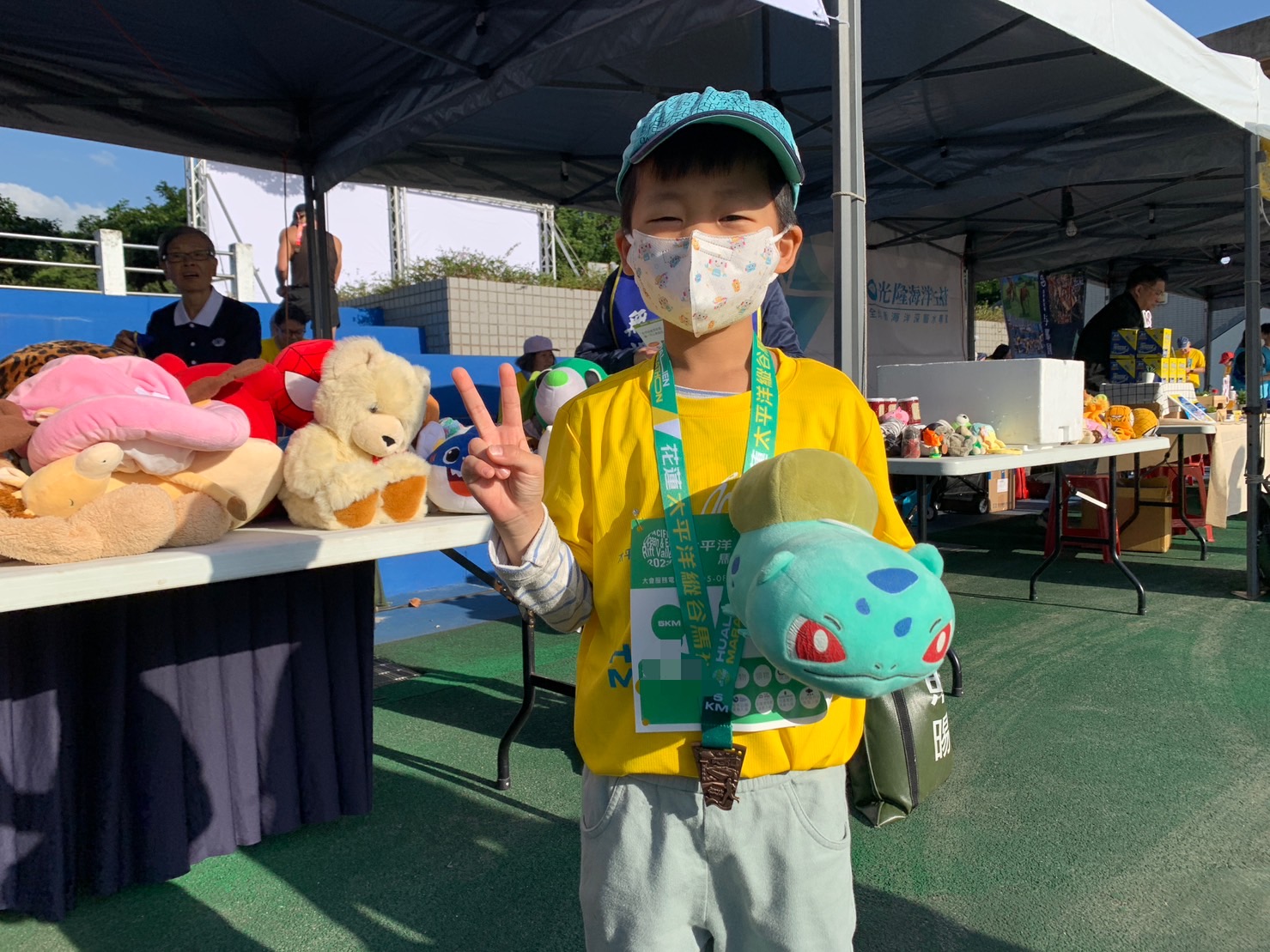 小朋友睿睿跟媽媽跑完五公里迷你馬後,便來到慈濟骨髓細胞中心的攤位前,在師姑的引導下,在彩色球池區體驗「HLA基因配配看」遊戲,選出自己的HLA球,限十秒內從球池裡撈出與自己同色的球,代表找到與自己基因相近的初步配對者,再從撈出來的球堆裡找出與基因代碼相同的球。睿睿非常幸運的第一次就找到和自己同色同號碼的球,開心地獲得自己最喜歡的布偶。