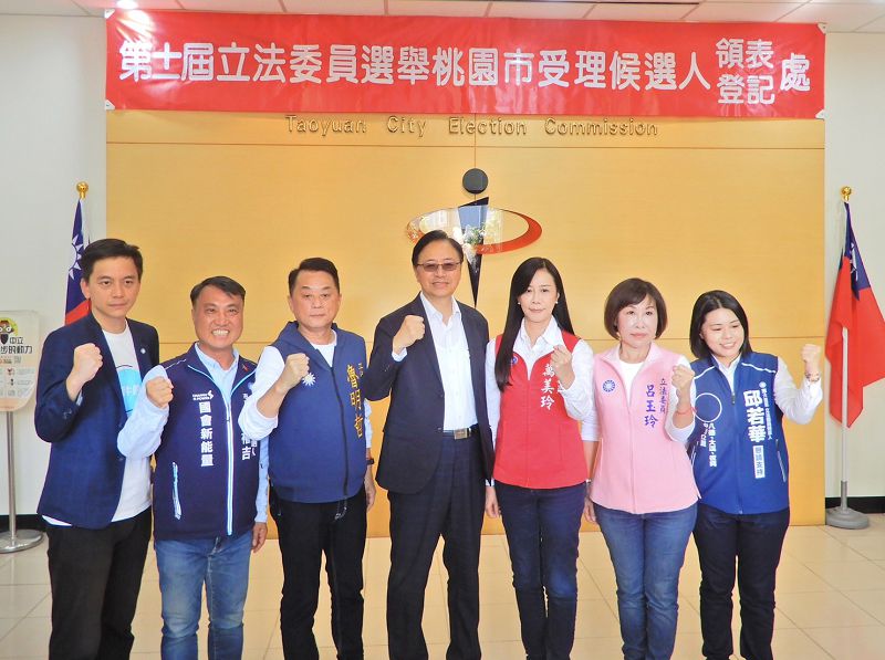 【記者鍾陽正桃園報導】國民黨提名六位桃園市區域立委參選人牛煦庭、涂權吉、魯明哲、萬美玲、呂玉玲、邱若華於日前齊聚市選委會舉行聯合登記造勢,市長張善政、議長邱奕勝市黨部主委黃敏恭、黃國園黨部主委蔡忠誠、黨團總召梁為超、黨籍市議員及各競選團隊均到場助陣,營造桃園大團結的決心,現場並高呼「政黨要輪替,國會拚過半」的勝選口號,相當盛大熱鬧。