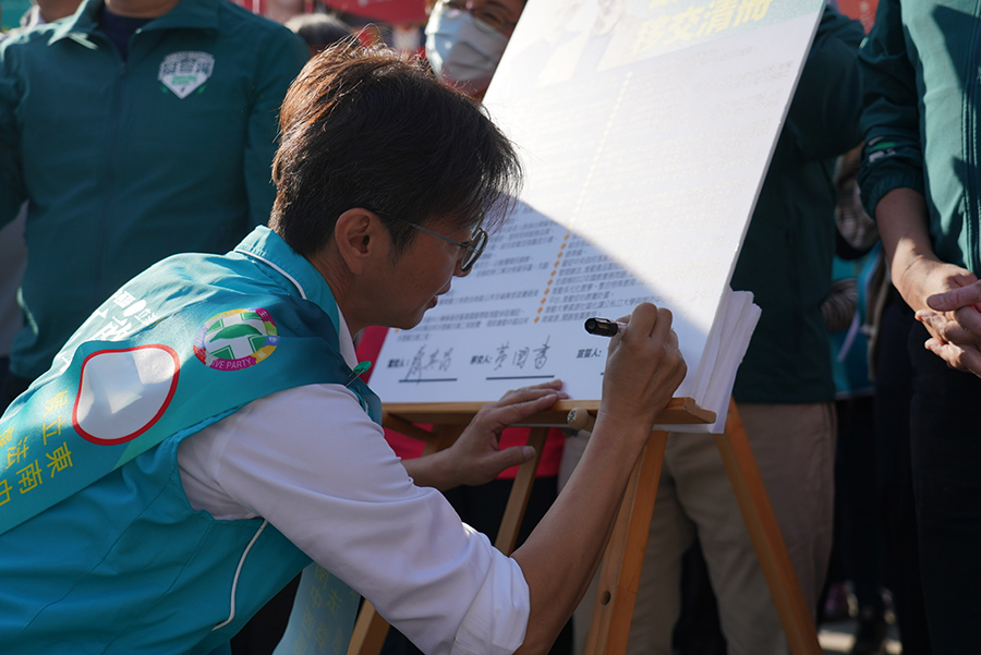 圖說2:江肇國接過立委黃國書移交清冊後,當民眾的面前簽名宣誓,將全心全力積極落實黃國書所列出對鄉親的所有允諾。(記者林獻元攝)