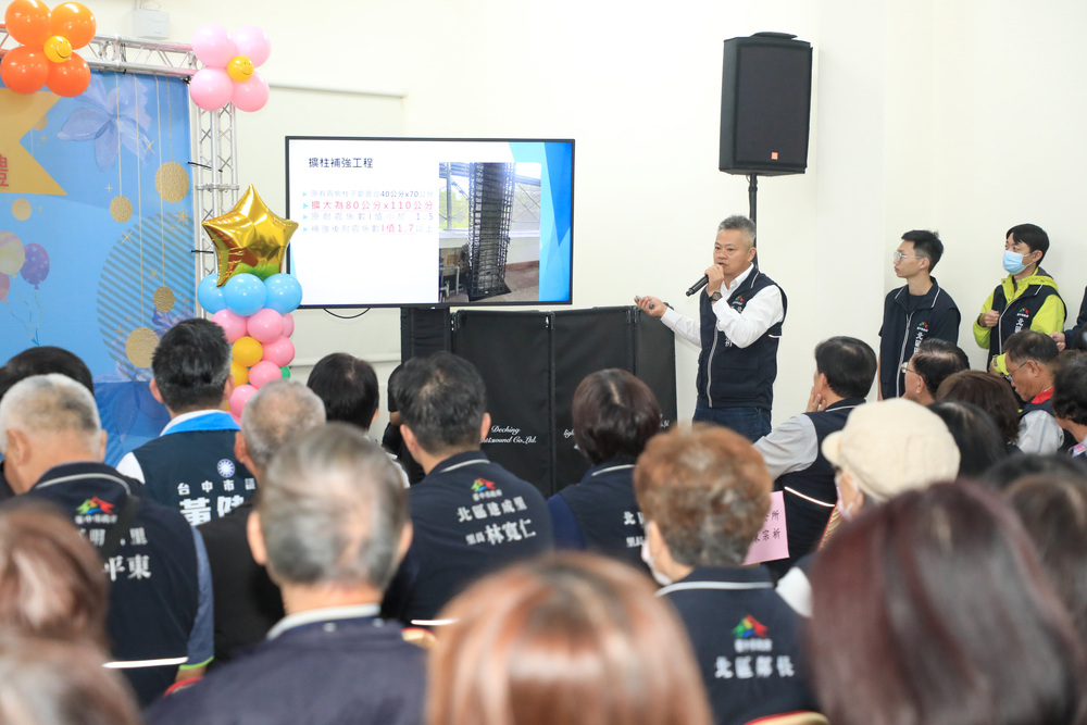 北區區長陳宗祈說明,此次耐震補強工程採擴柱工法,於既有列柱的四周植入鋼筋並澆置混凝土,列柱結構加粗加厚提升耐震能力,感謝市府及中央挹注經費。活動中心修繕啟用後,公所將持續推展各項社區化福利服務,包括開設各式會議課程、老人健康活動及民俗文化活動等,促進社區發展及凝聚居民向心力,提升活動中心使用率。